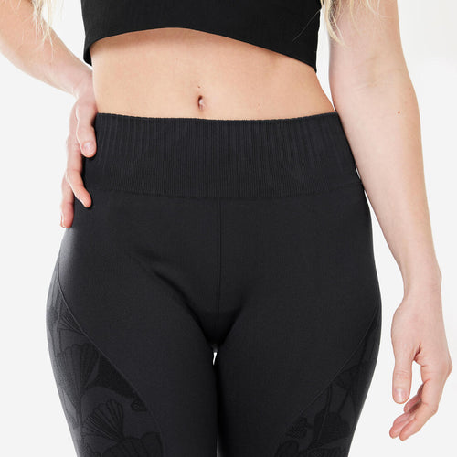 Taille haute pour un bon maintien lors des inversions, structures en maille piquée pour une meilleure opacité , graphismes discrets ton sur ton de fleurs de gingko dans le jacquard le long des jambes.