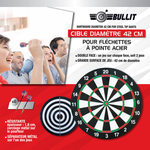 Envie de découvrir les fléchettes traditionnelles? Cette cible réversible d'un diamètre de 42 cm est fournie avec 6 fléchettes.Facile à installer, elle a tout pour partager de bons moments en famille.