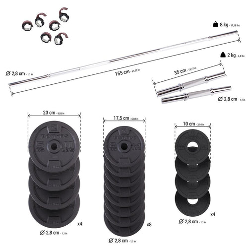 - 2 barres pleines de 2 kg longueur 35 cm et de diamètre 28 mm. - 1 barre de 155 cm 7,8 kg (160 kg de charge maxi) - 4 disques de fonte 5 kg, - 8 disques de fonte 2 kg, - 4 disques de fonte 0,5 kg - Le kit contient 3 paires de stop disques