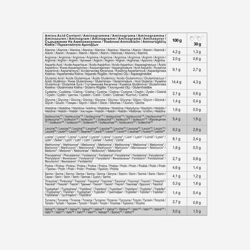 Tableau nutritionnel: 100 g | Par dose de 30 g Energie: 397 kcal | 119 kcal 1679 kJj | 504kJ Matières grasses: 5,4 g | 1.6g dont acides gras saturés: 3,0 g | 0.9 g Glucides: 12 g | 3.6 g dont sucres: 6,8 g | 2.0 g Protéines: 75 g | 23 g Sel: 0,94 g | 0.28 g