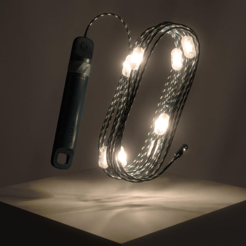 Cette guirlande de camping de 200 lumens diffuse une lumière à 360° pour éclairer 4 à 8 personnes. Elle offre une autonomie de 6 à 17h via USB-C et se suspend grâce à ses 3 crochets intégrés.