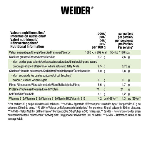 La protéine de pois, grâce à son excellente composition en acides aminés, est la meilleure protéine végétale, offrant une valeur nutritionnelle comparable à celle de la protéine de lactosérum. La protéine principale de Vegan Protein est l\'isolat de pois (Pisane C9), laquelle a été enrichie avec de la protéine de riz. En combinant la protéine d\'une légumineuse avec celle d\'une céréale, on obtient une protéine de haute valeur biologique et facile à digérer.