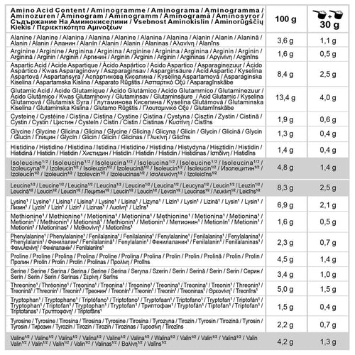Tableau nutritionnel : POUR 100 g | PAR PORTION DE 30 g Energie: 361 kcal | 108 kcal Energie: 1538 Kj | 461 Kj Matières grasses: 3,7 g | 1,1 g dont acides gras saturés: 2,1g | 0,6 g Glucides: 14 g | 4,2 g dont sucres: 10 g | 3,1 g Protéines: 70 g | 21 g Sel: 1,3 g | 0,45 g