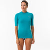 Tee shirt anti-UV femme manches courtes pour protéger du soleil, même dans l'eau, et limiter les irritations au contact de la planche. Coupe ajustée pour une meilleure stabilité dans la vagues.