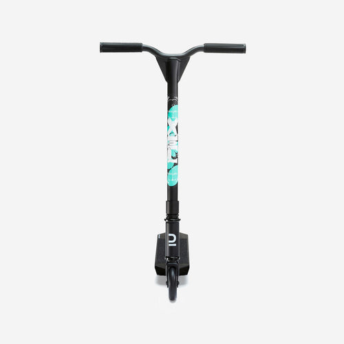 T-bar monobloc en acier. Dimensions = Ø31,8 h = 510mm, L = 420 mm. Angle T-bar/Deck : 82.5°. Hauteur total : 770mm Les graphismes de cette trottinette MF100 ont été réalisées par un rider pro. Nous avons aussi amélioré les poignées pour un meilleur confort.