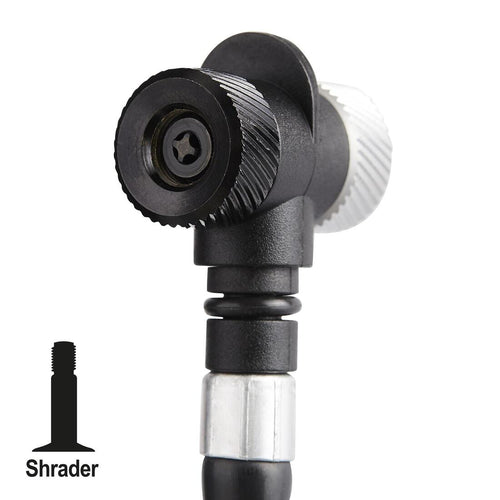 Connexion à tous les types de valves (Presta, Schrader, Dunlop) par vissage. L\'adaptation se fait via la double tête.