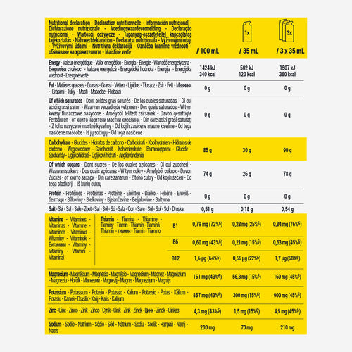 Valeurs nutritionnelles : 100g | 46g (=1 gel énergétique, 35ml) Valeur énergétique : 1437kJ – 343kcal | 503kJ – 118kcal Matières grasses : 0g | 0g dont acides gras saturés : 0g | 0g Glucides : 86g | 30g dont sucres : 37g | 13g Protéines : 0g | 0g Sel : 0g | 0g
