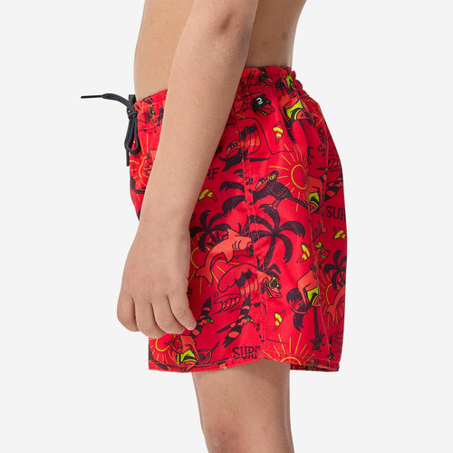 La ceinture élastiquée de ce maillot de bain s\'ajuste de manière précise à la taille de l\'enfant. Le cordon de serrage périphérique évite que le short de bain ne bouge une fois en place, et permet de jouer ou de surfer sans crainte dans les vagues !