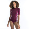 Tee shirt anti-UV manches courtes pour protéger du soleil, même dans l'eau, et limiter les irritations au contact de la planche. Nœuds latéraux d'attache du maillot pour la tenue dans la vague.